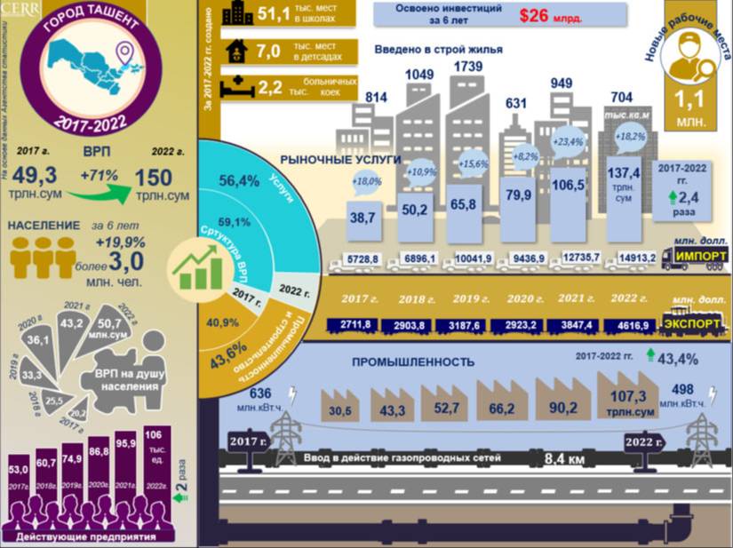 За 2017-2022 годы валовой региональный продукт (ВРП) столицы увеличился с 49,3 трлн сумов до 150 трлн. сумов, а его реальный темп роста повысился на 71%. Данное изменение позволило увеличить объем ВРП на душу населения на 50,7 млн сумов. Также за эти годы население увеличилось на 19,9% и превысило 3 млн человек.
