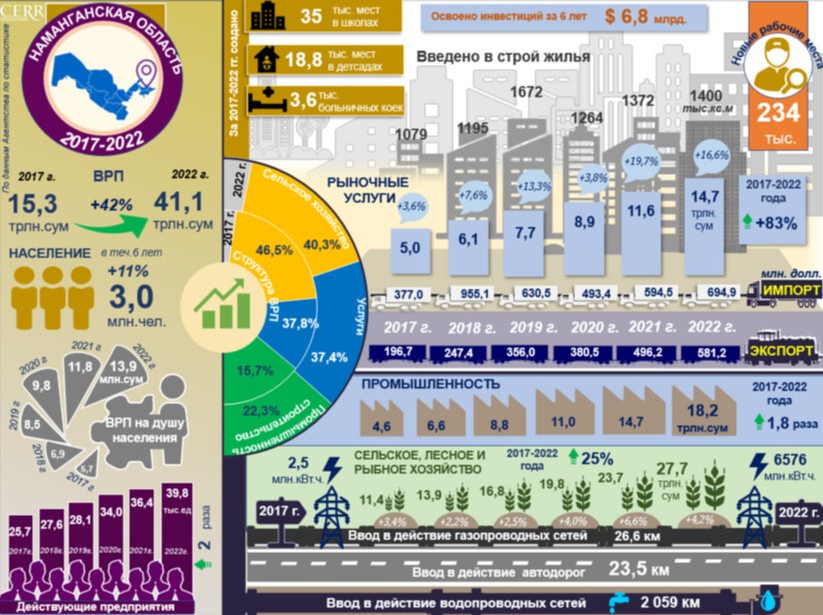 За 2017-2022 годы валовой региональный продукт (ВРП) области увеличился с 15,3 трлн сумов до 41,1 трлн сумов, а его реальный объем вырос на 42%. Это, в свою очередь, обеспечило рост ВРП на душу населения с 5,7 млн сумов до 13,9 млн сумов. За этот период население области увеличилось на 11% и достигло 3,0 млн человек.