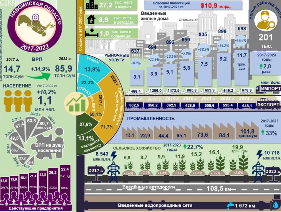 За последние семь лет количество предприятий, работающих в области, увеличилось более чем в 1,9 раза, с 12 тысяч в 2017 году до 22,4 тысяч в 2023 году. В Навоийской области создано около 201 тысячи новых рабочих мест, а количество безработных резко сократилось.