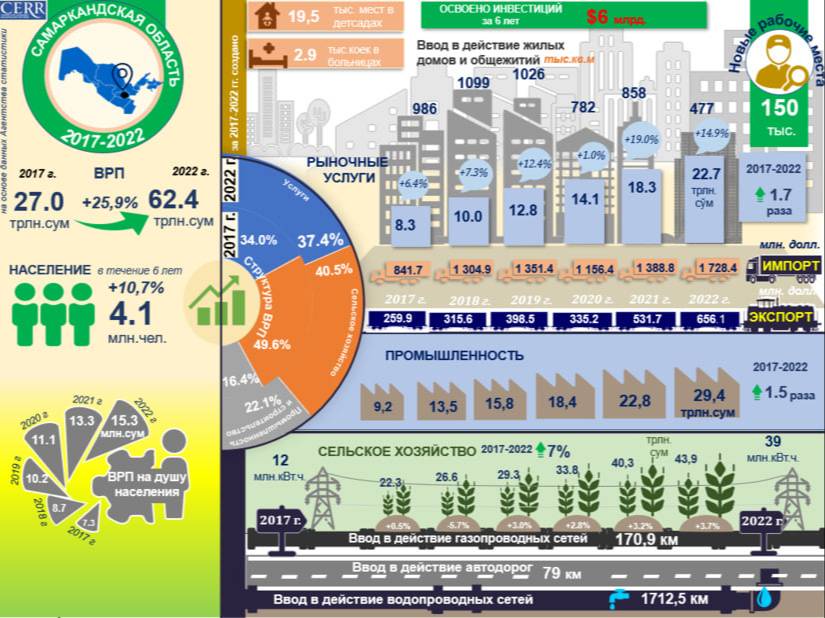 За 2017-2022 годы валовой региональный продукт (ВРП) Самаркандской области увеличился с 27,0 трлн сумов до 62,4 трлн сумов, а его реальный объем вырос на 25,9%. Это обеспечило рост ВРП на душу населения с 7,3 млн сумов до 15,3 млн сумов. За этот период население области увеличилось на 10,7% и достигло 4,1 млн человек.