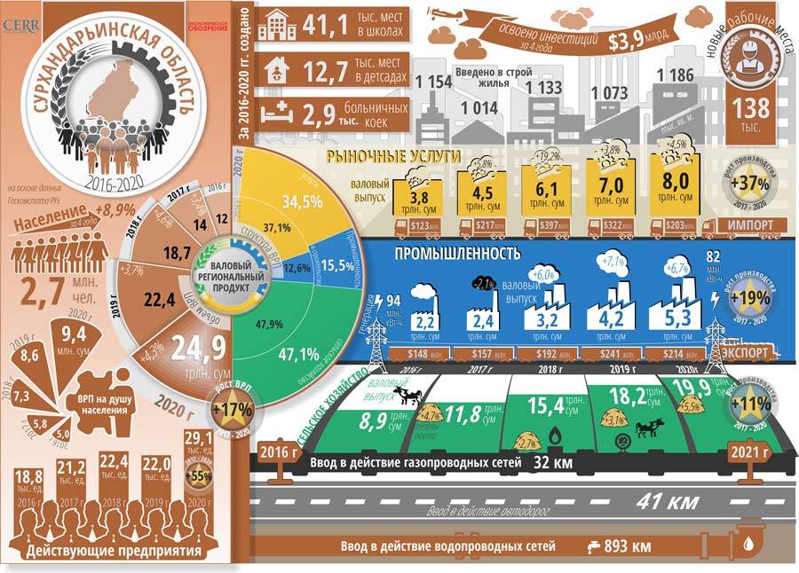 Валовой внутренний продукт региона (ВРП) за 2017-2020 гг. увеличился на 17% и составил 24,9 трлн сумов.