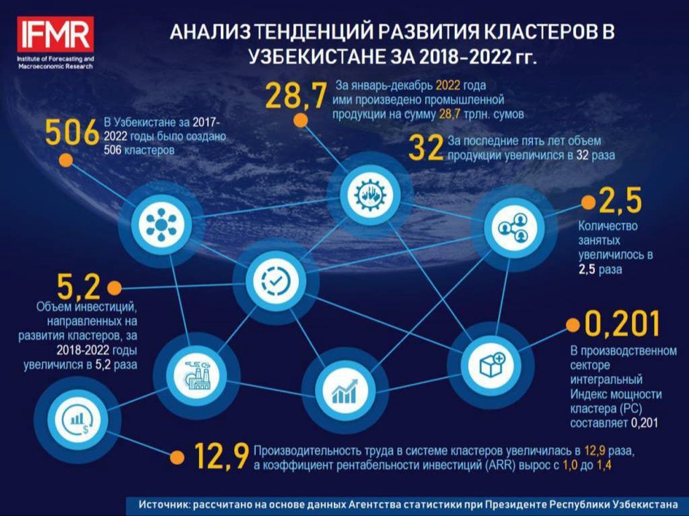 Анализ тенденций развития кластеров в Узбекистане в 2018-2022 годах проведен экспертами Института прогнозирования и макроэкономических исследований (ИПМИ).