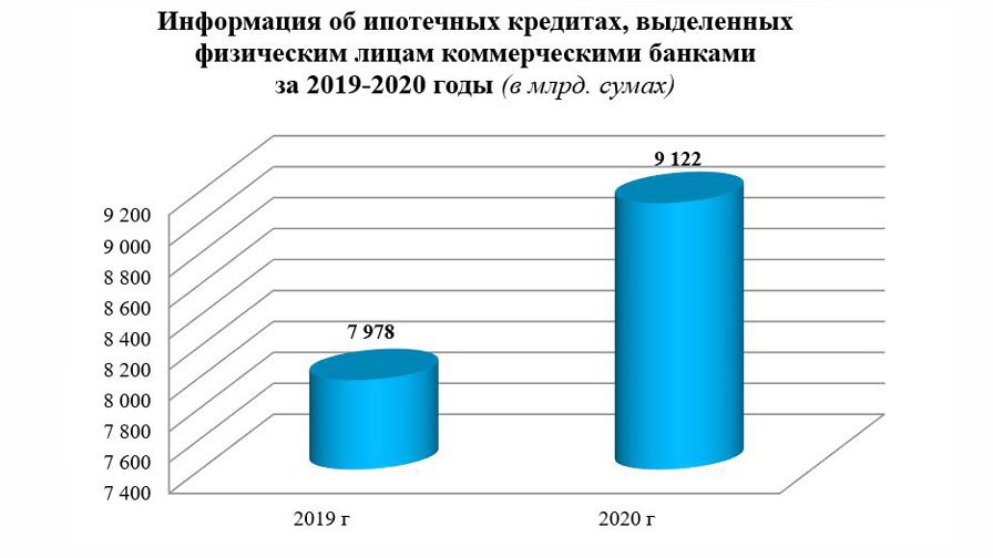 Указом Президента Республики Узбекистан № УП-5886 от 28 ноября 2019 года “О дополнительных мерах по совершенствованию механизмов ипотечного кредитования” был принят Новый порядок ипотечного кредитования, на основании которого 7 927 гражданам выделены кредиты общей стоимостью в 1747,0 млрд. сумов. В частности, 749,0 млрд. сумов (42,9%) выданы на приобретение 1 и 2-х комнатных квартир, 998,0 млрд. сумов (57,1 %) – на приобретение 3-х и более комнатных квартир.