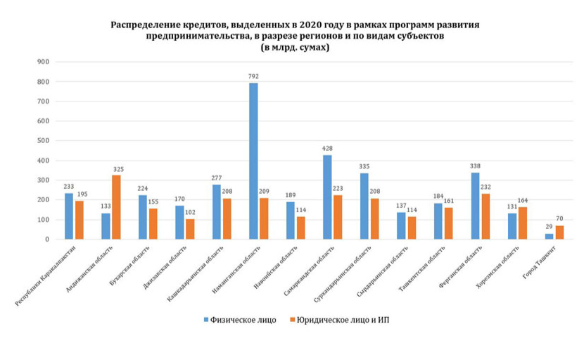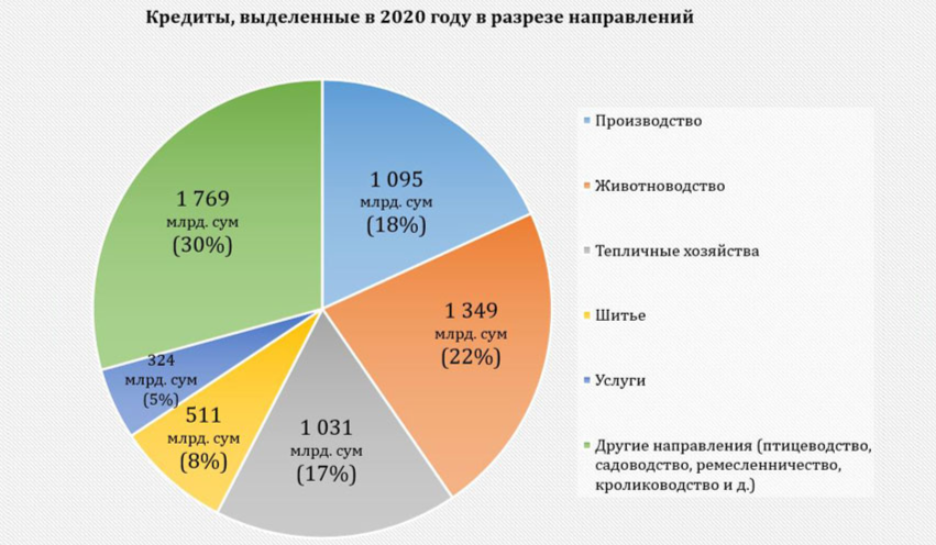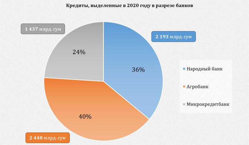 Из выделенных кредитов 2 трлн. 479 млрд. сумов (41%) направлено юридическим лицам и индивидуальным предпринимателям, 3 трлн. 599 млрд. сумов (59 %) выделено самозанятым физическим лицам. Основное внимание уделено финансированию проектов субъектов предпринимательства, предусматривающих дополнительные источники доходов для населения, а также созданию гарантированных новых рабочих мест.