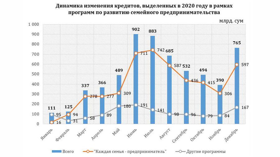 На долю программы «Каждая семья - предприниматель» приходится 78% (4,8 трлн. сумов),  остальные 22% (1,3 трлн. сумов) – на другие программы.