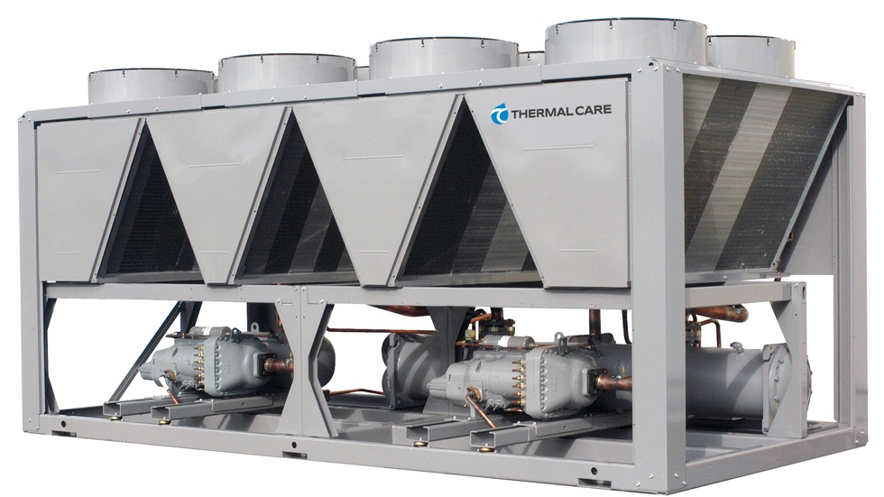 Чиллеры с воздушным охлаждением отводят тепло с помощью вентиляторов, которые нагнетают воздух через открытые трубы конденсатора. Они требуют больше энергии, чем чиллеры с водяным охлаждением, но затраты на установку меньше, поскольку они имеют меньше оборудования и занимают меньше места. Они более подвержены засорению и проблемам с рециркуляцией, чем чиллеры.