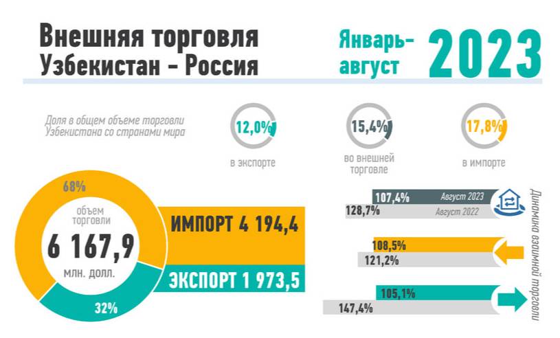 За последние 6 лет товарооборот Узбекистана с Россией вырос почти в 2 раза с $4,73 млрд в 2017 г. до $9,33 млрд. в 2022 г., экспорт вырос в 1,5 раза с $2,0 млрд. до $3,1 млрд., импорт в 2,3 раза с 2,7 млрд. до $6,23 млрд.