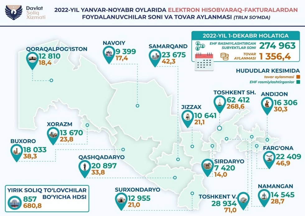 За 11 месяцев текущего года общий товарооборот в ЭСФ превысил 1 356,4 трлн сумов, что на 342 трлн сумов больше по сравнению с соответствующим периодом предыдущего года.