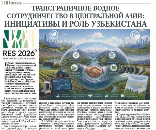 За последние годы Узбекистан занял активную позицию в формировании новой модели водного взаимодействия - открытой, прагматичной и ориентированной на долгосрочное сотрудничество. С учетом того, что вода является стратегическим ресурсом и ключевым фактором устойчивого развития, все более актуальной становится консолидация усилий государств региона для решения вопросов трансграничного водопользования.