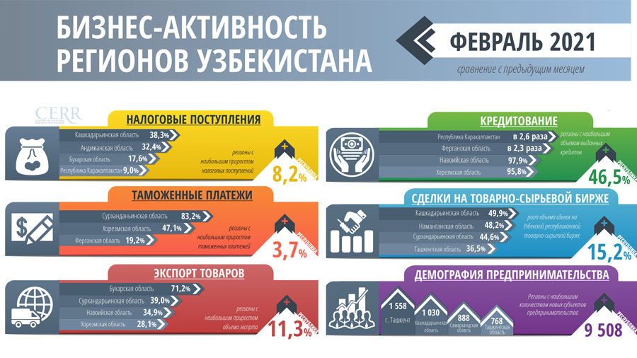 Анализ бизнес активности в разрезе регионов Республики Узбекистан ежемесячно рассчитывается ЦЭИР на основе оперативных данных (мониторинг по всем регионам республики, согласно данным ГТК, ГНК, ЦБ и УзРТСБ).