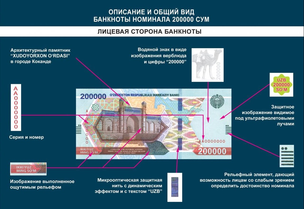 При этом Центральный банк Республики Узбекистан отмечает банкноты достоинством 200 000 сум, наряду с находящимися в обращении денежными знаками и монетами, обязательны к приему по нарицательной стоимости во всех видах платежей, всеми хозяйствующими субъектами и населением без всяких ограничений.