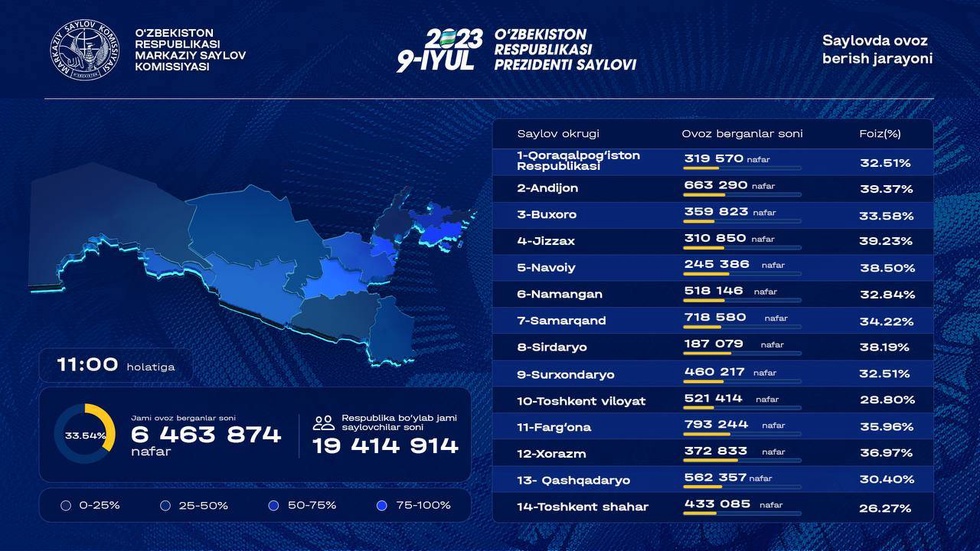 Напомним, в воскресенье, 9 июля, на свыше 10,7 тысячи избирательных участках в Узбекистане стартовал процесс голосования по досрочным выборам Президента Узбекистана. Участки открыты с 08:00 до 20:00.