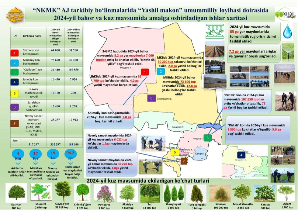 Так, в весенний и осенний сезоны текущего года планируется посадить 460 тыс. саженцев декоративных и плодовых деревьев и кустарников. Нынешней весной высажено 300 тыс. деревьев. Более 232 тыс. саженцев деревьев, высаженных на 170,8 га земли подразделениями комбината, включены в электронную платформу Министерства экологии, охраны окружающей среды и изменения климата «yashilmakon.eco». В рамках национального проекта «Яшил макон» в осеннем сезоне этого года будет высажено 160 тыс. саженцев декоративных и плодовых зеленых насаждений, кустарников. В настоящее время ведется строительство «зеленых поясов» и озеленение территорий, где расположены промышленные предприятия, и вокруг них. Отобраны соответствующие земельные участки для проведения агротехнических мероприятий. Сообщается, 85 га будут орошаться посредством системы капельного орошения, еще 7,2 га - с использованием ресурсов местных арыков и водоканалов. Создаваемые в будущем «зеленые пояса» послужат обеспечению экологической стабильности.