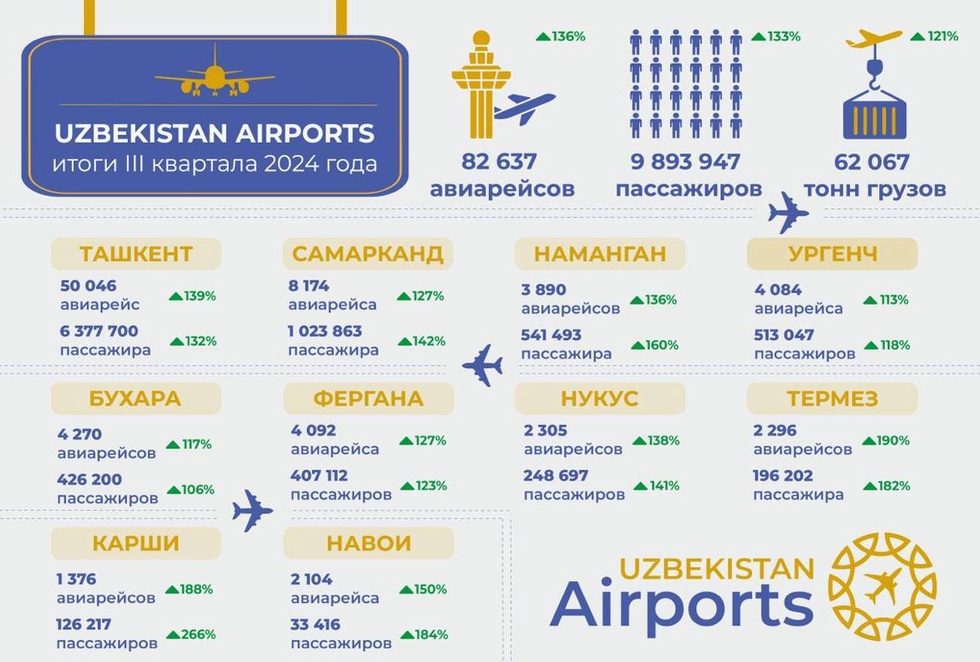 С января по сентябрь включительно аэропорты Узбекистана обслужили 9 893 947 пассажиров. В том числе, 1 871 659 пассажиров, совершивших внутренние перелеты, и 8 022 288 - международные. Прирост к аналогичному периоду 2023 года составил 133%.