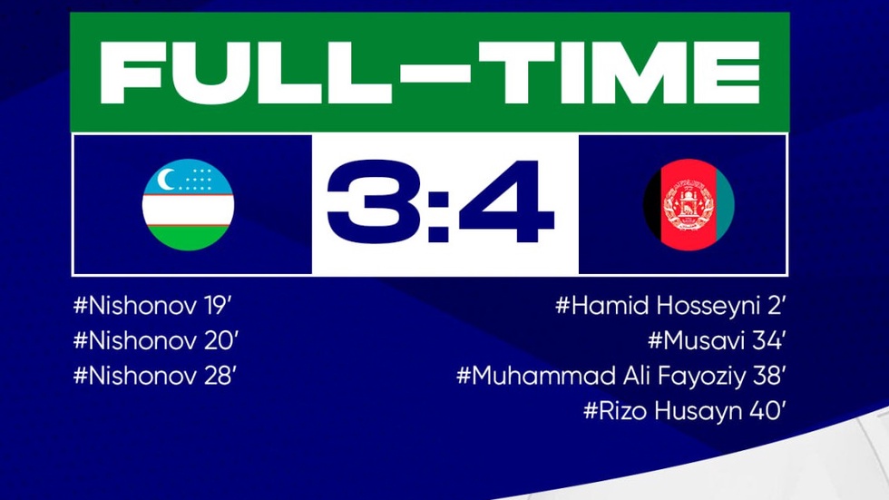 Узбекистан - Афганистан - 3:4 (Нишонов, 19, 20, 28 - Хоссейни, 2, Мусави, 34, Али Фаёзи, 38, Ризо Хусайн, 40).