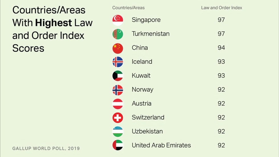 Рейтинг составляется на основе опроса жителей разных стран. Им задают вопросы о том, доверяют ли они полиции, боятся ли ходить по улицам по ночам, грабили ли их или их родственников в последний год и т.п.