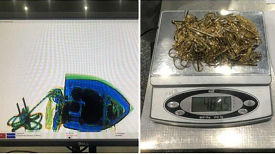 В результате проведенного таможенного контроля с использованием современного сканирующего оборудования выяснилось, что внутри обычного на первый взгляд утюга, который был спрятан среди личных вещей, были спрятаны ювелирные украшения, изготовленные из золота общим весом 481,5 гр. По предварительным подсчетам общая стоимость украшений составила 168 миллионов сумов.