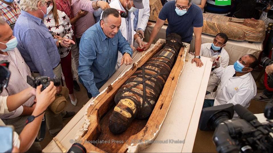 Представители Министерства туризма и древностей Египта открыли один из саркофагов, найденных во время масштабных раскопок в некрополе Саккара к югу от Каира. Журналистам показали содержимое гроба – останки мумии, покрытые погребальной тканью.