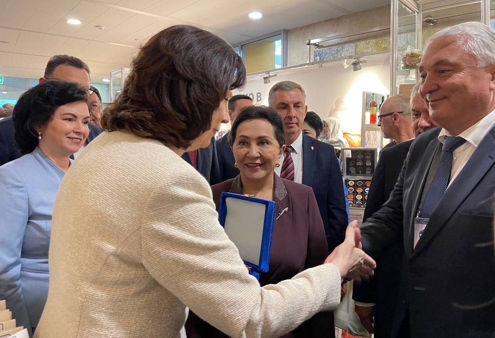 Заместитель председателя Торгово-промышленной Узбекистана Жамшед Ураков представил председателю Совета Республики Национального собрания Республики Беларусь Наталье Кочановой и председателю Сената Олий Мажлиса Республики Узбекистан Танзиле Нарбаевой продукцию отечественного производства.