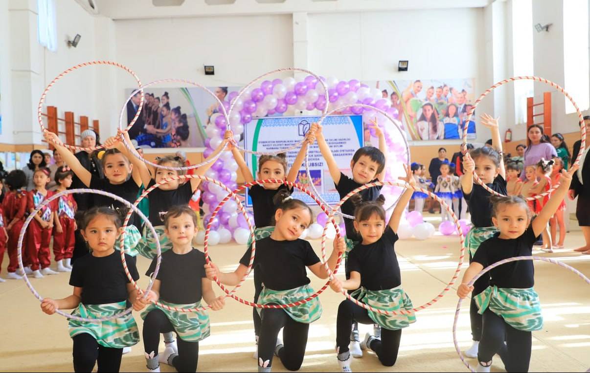 В ходе состязаний юные грации демонстрировали народный, современный танец и другие виды гимнастики с использованием снарядов художественной гимнастики - обруча, мяча и скакалки, а мальчики - с гимнастическими палками.