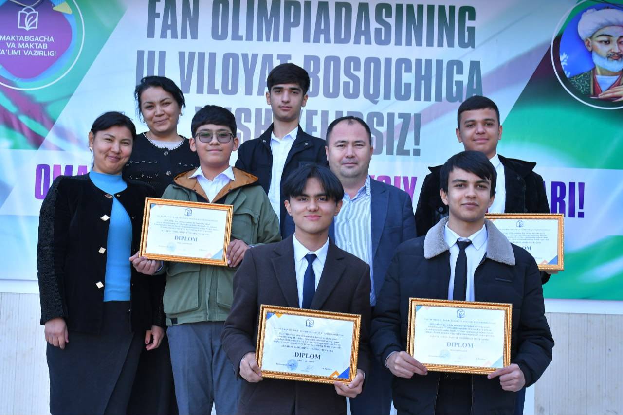 Так, среди учащихся 11-х классов, академлицеев и профессиональных школ в олимпиаде по химии тройку победителей и призеров возглавили учащиеся специализированной школы с углубленным изучением отдельных предметов № 11 города Навои. Старшеклассники специализированной школы-интерната №1 Мардон Хазратов стал победителем по предмету информатика и информационные технологии, Асадбек Аслонов - по математике. Учащаяся школы №2 Нуратинского района Маржона Примова показала лучшие знания по предмету биология, Озодбек Примов из общеобразовательной школы № 11 Хатырчинского района - по физике.
