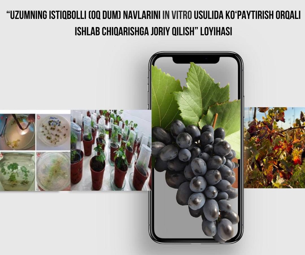 Сегодня можно увидеть первые результаты проделанной работы в рамках проекта, разработанного Центром геномики и биоинформатики и ООО «KARMANA TOMORQA XIZMATI» «Внедрение в производство перспективных сортов винограда путем размножения in vitro». Агентством инновационного развития при Министерстве высшего образования, науки и инноваций на его реализацию выделена сумма в размере 1,0 млрд сумов. В апреле текущего года было высажено 8000 саженцев виноградной лозы.