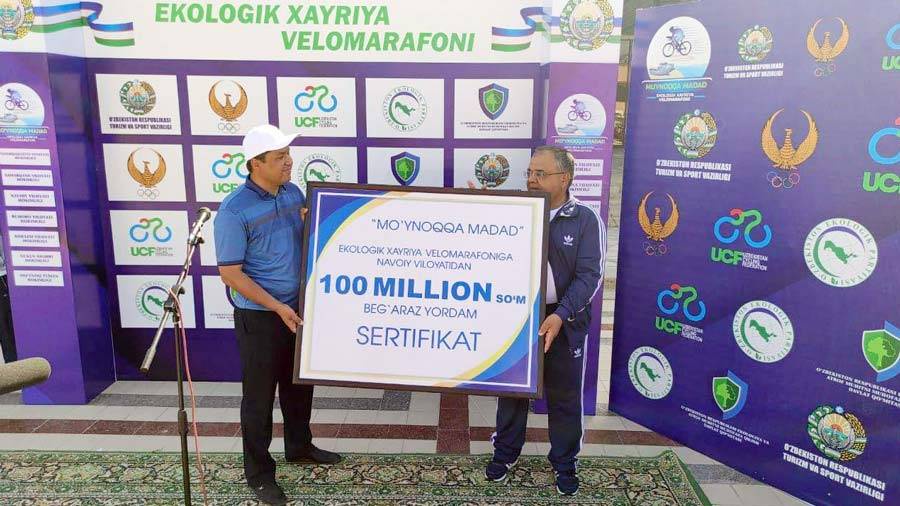 Во второй половине дня в областном центре для участников веломарафона прошел благотворительный концерт. Рано утром следующего дня был дан официальный старт очередному этапу проекта в Навоийской области. Выступая и приветствуя всех собравшихся, глава региональной администрации Кобул Турсунов отметил значимость мероприятия, нацеленного на помощь в решении экологических проблем и улучшении условий жизни жителей Приаралья. Поскольку одной из целей проекта является привлечение добровольных благотворительных и спонсорских средств предприятий и организаций, предпринимателей и активных граждан, в качестве благотворительного вклада навоийцев передал активистам Экологической партии Узбекистана сертификат на сто миллионов сумов. Средства, полученные с марафона, будут направлены на решение проблем Муйнака, таких как улучшение ирригационных систем, строительство водоснабжающих объектов, создание рабочих мест и обеспечение населения чистой питьевой водой.