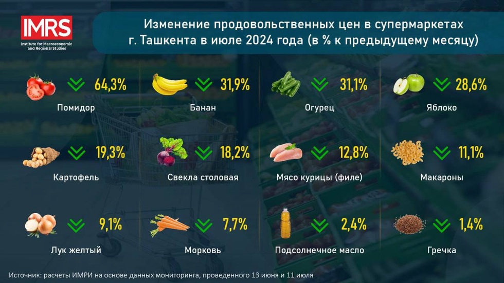 Наибольшее снижение цен отмечено на помидор (снижение на 64,3%), банан (-31,9%) и огурец (-31,1%).