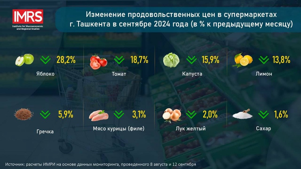 Так, снижение цен на яблоки составило 28,2%, томаты - 18,7%, капусту - 15,9%, лимоны - 13,8%, гречку - 5,9%, мясо курицы (филе) - 3,1%, лук желтый - 2,0%, сахар - 1,6%.