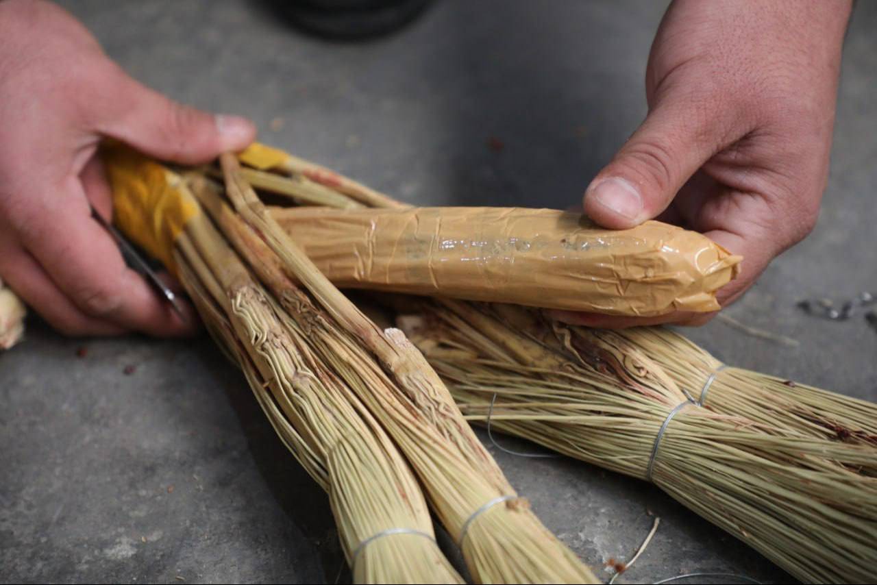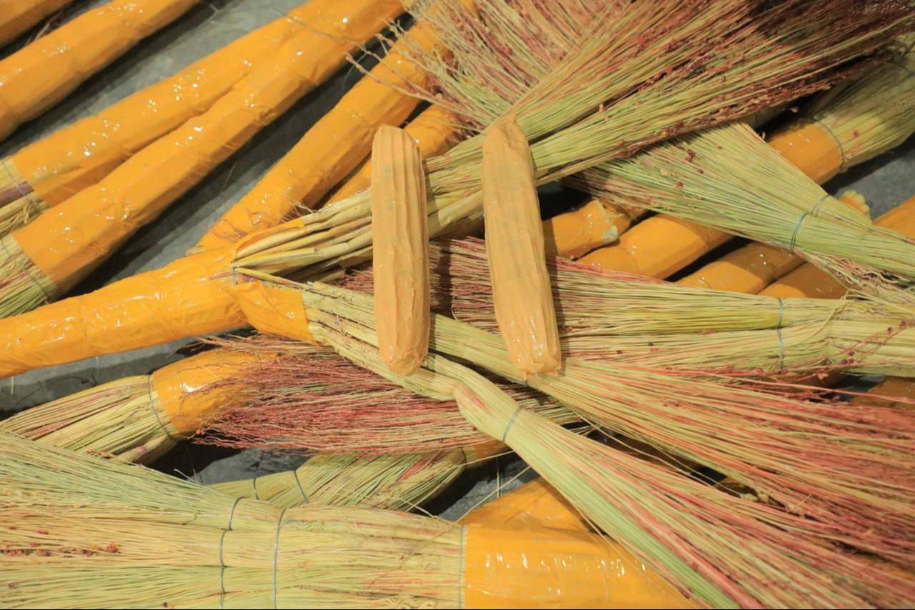 При проверке выяснилось, что в 180 мешках находилось 22 500 хозяйственных метел, изготовленных из сорго. Однако при детальном осмотре было обнаружено, что в ручках 2986 метел были искусно спрятаны полиэтиленовые свертки длиной около 25 см, обмотанные желтой лентой, совпадающей по цвету с материалом метел.