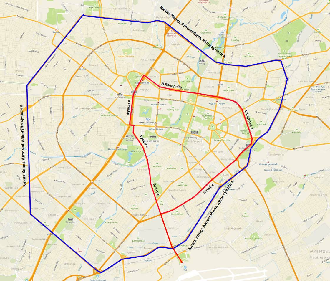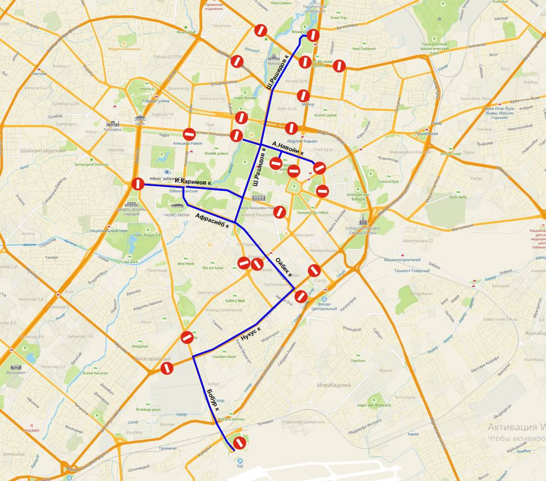 - от перекрестка улиц Ойбек и Туркистан будет ограничено движение по улицам Ойбека, Афросиаб и Олмазор.