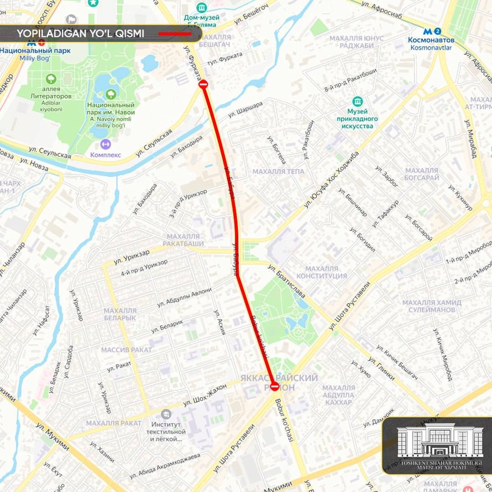 Как сообщили в пресс-службе ООО «Тошкент шахар электр тармоклари», это связано с тем, что «в целях стабильного обеспечения энергоресурсами потребителей Шайхантахурского района планируется проведение работ по прокладке подземных кабельных сетей высоковольтной электропередачи 110 кВ на участке улицы Бабура от пересечения с улицей Шота Руставели до пересечения с улицей Сеул».
