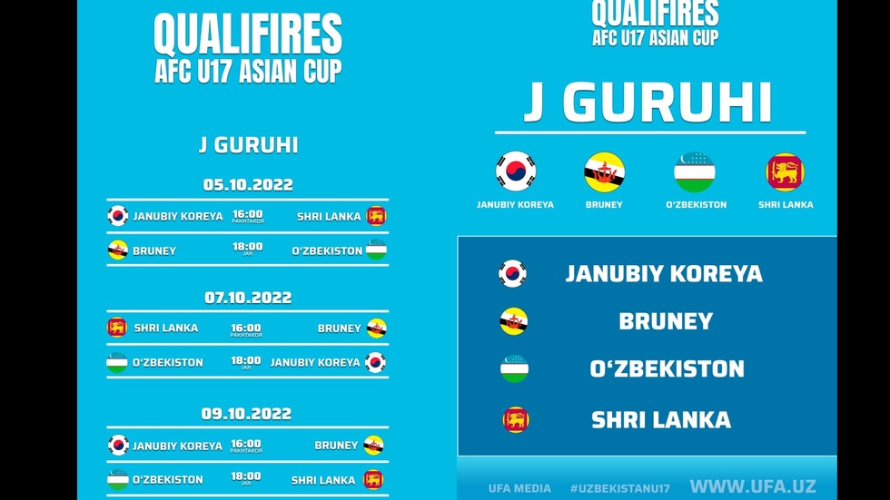 Сборная Узбекистана до 17 лет сыграет в группе J с соперниками из Брунея, Южной Кореи и Шри-Ланка.