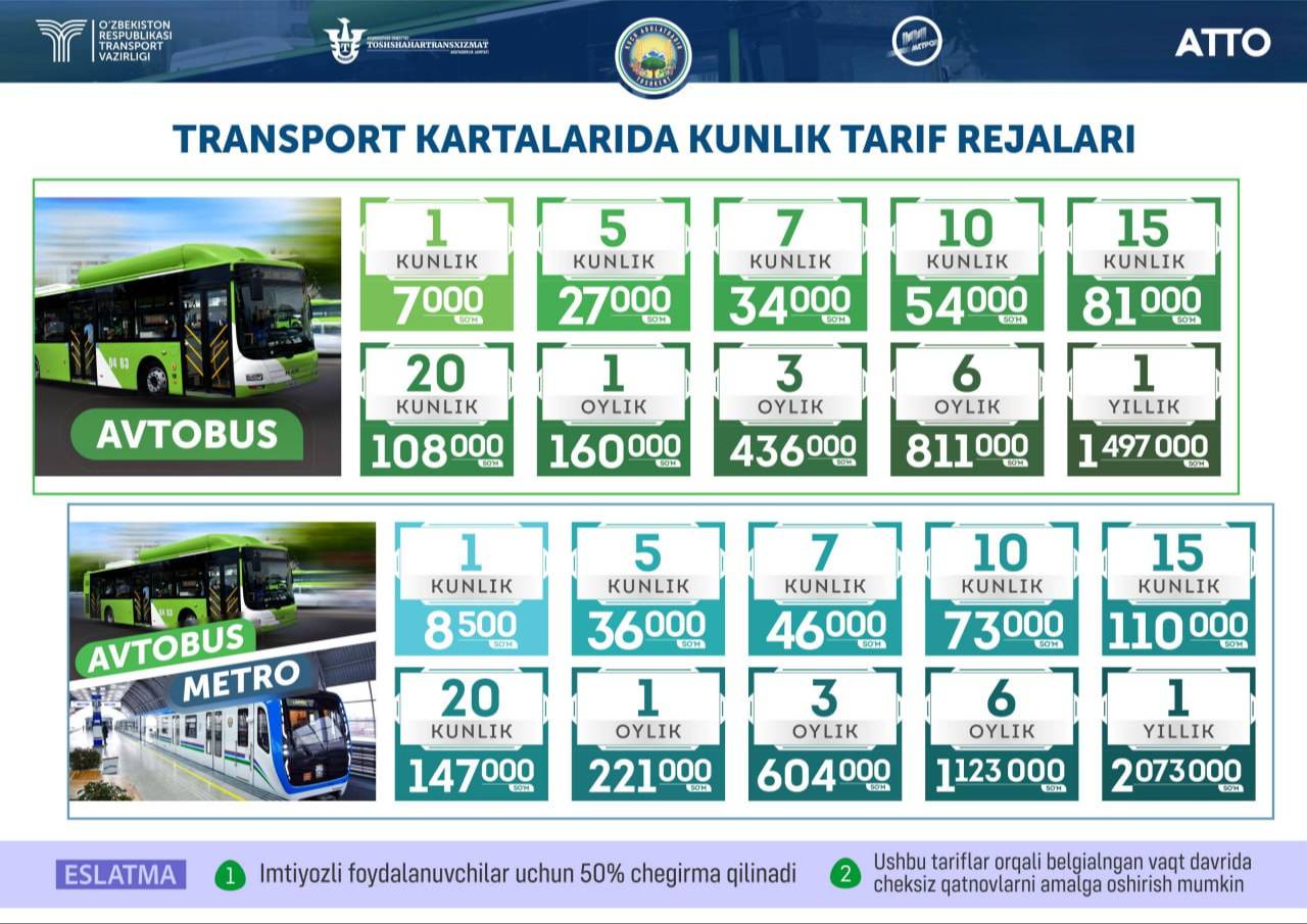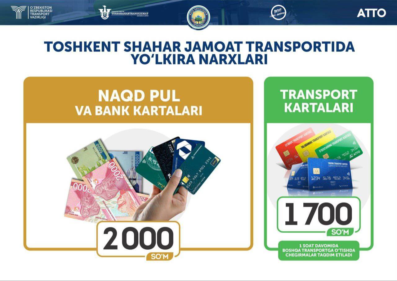Лимитированные тарифы на проезд одного пассажира установлены в размере 2000 сумов при оплате наличными и банковскими картами, и 1700 сумов - при оплате транспортными картами АТТО.