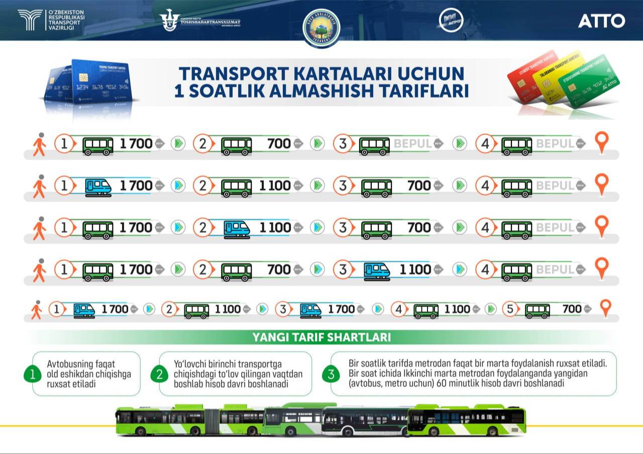 Пассажиры, пользующиеся транспортными картами АТТО, платят за проезд 700 сумов, если воспользуются автобусом второй раз в течение часа.