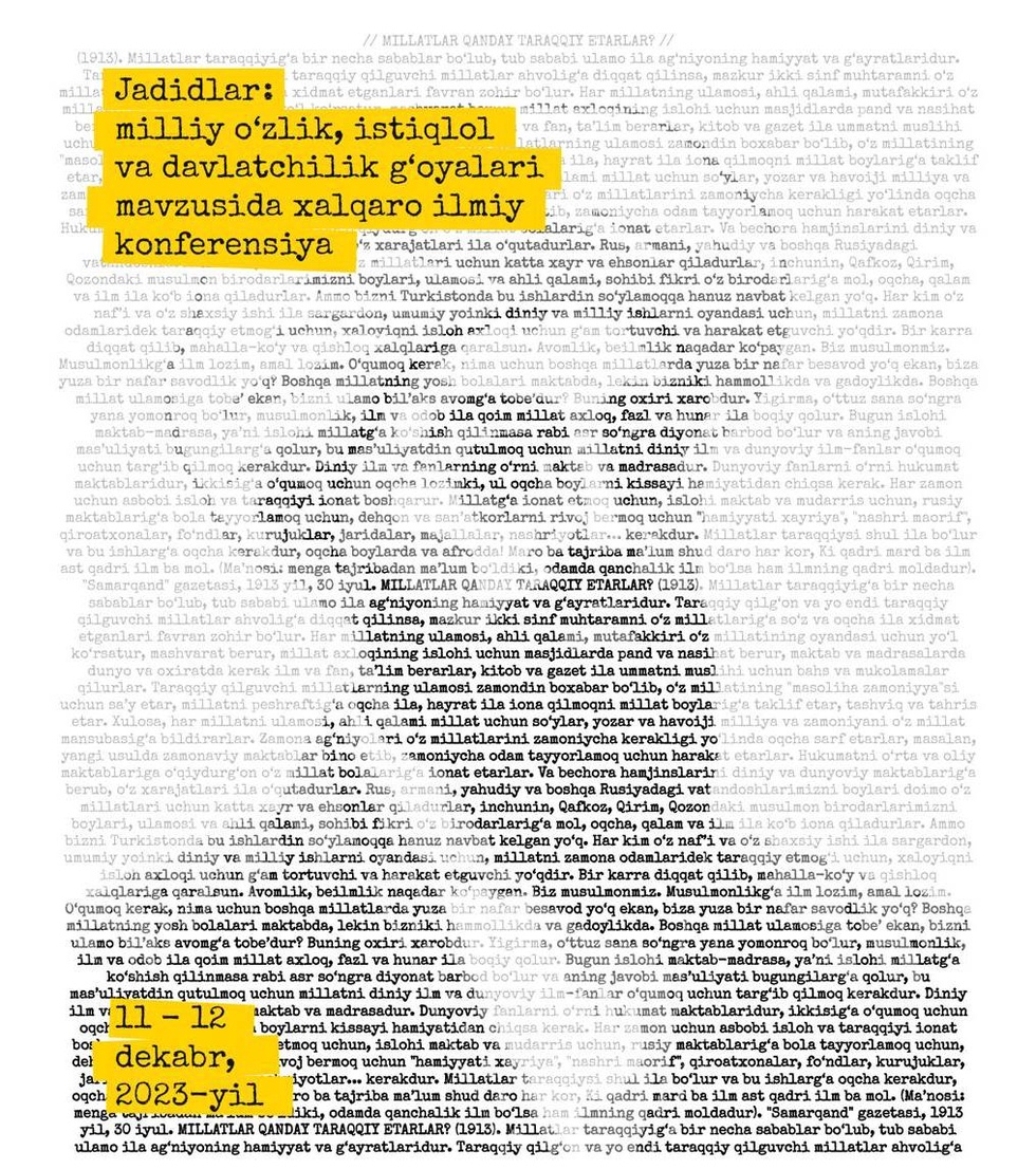 В первый день конференции состоится обмен мнениями о новых взглядах на изучение идеи, целей и задач движения джадидов, вклада движения в просвещение и издательское дело, общественно-политических усилий по формированию национальной государственности, а также научного и культурного наследия джадидов и их исследований.
