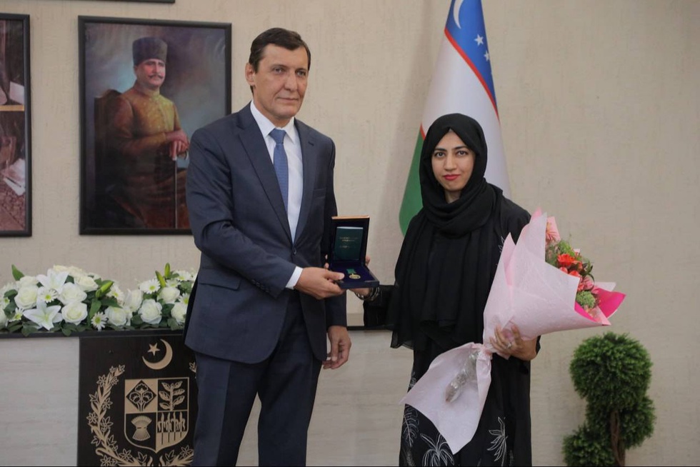 Второму секретарю Посольства Пакистана в Ташкенте Тубе Асиф за активную работу по укреплению пакистанско-узбекского сотрудничества был вручен нагрудной знак Центра народной дипломатии ШОС в Узбекистане «Народный дипломат».