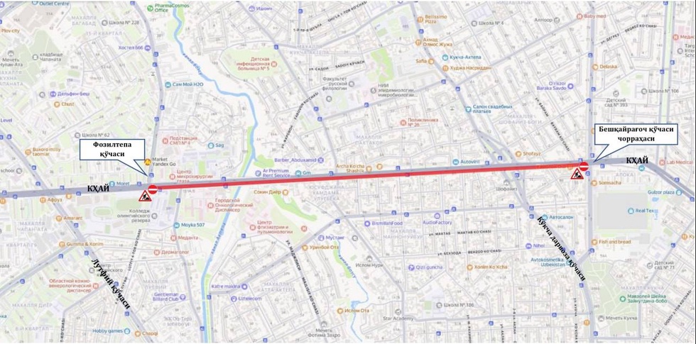 Движение по участку от перекрестка улицы Фозилтепа до перекрестка улицы Бешкайрагач будет частично ограничено - проезд временно закроют по одному направлению.