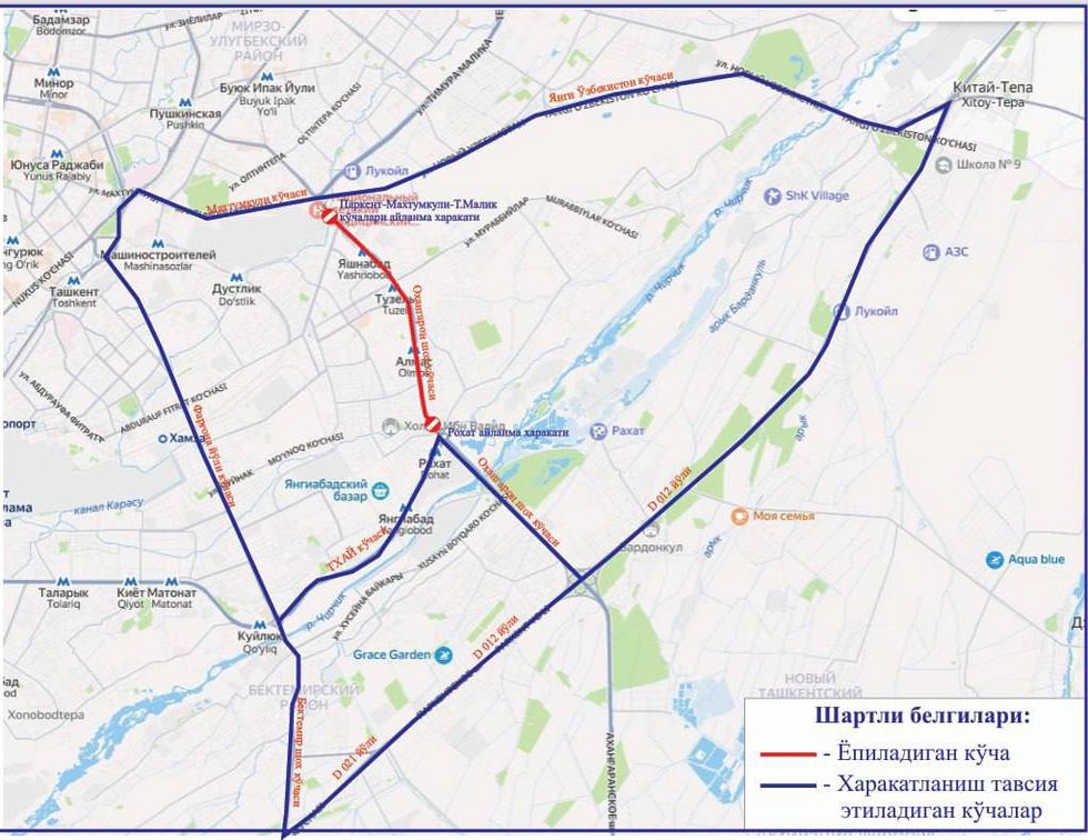 Закрытый участок дороги: от кольцевой развязки улиц Темур Малик - Паркент - Махтумкули до кольцевой развязки улиц ТКАД - Охангарон.