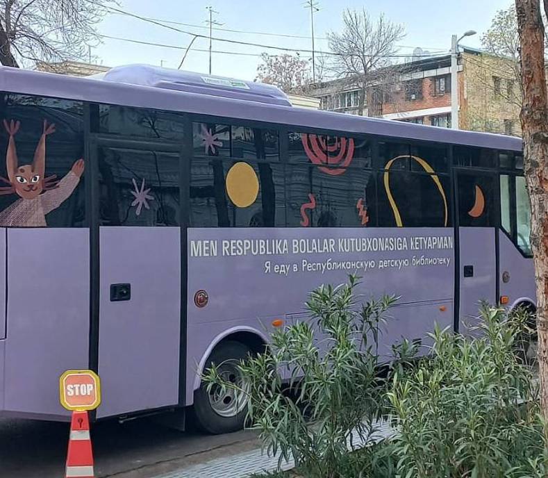 Автобус сиреневого цвета украшен надписями «Men Respublika bolalar kutubxonasiga ketyapman» - «Я еду в Республиканскую детскую библиотеку».