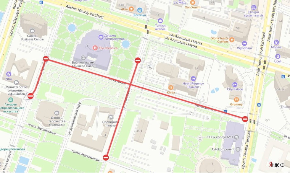 • участок улицы Зарафшон между контрольно-пропускным пунктом гостиницы «Hyatt Regency Tashkent» и улицей Матбуотчилар;
