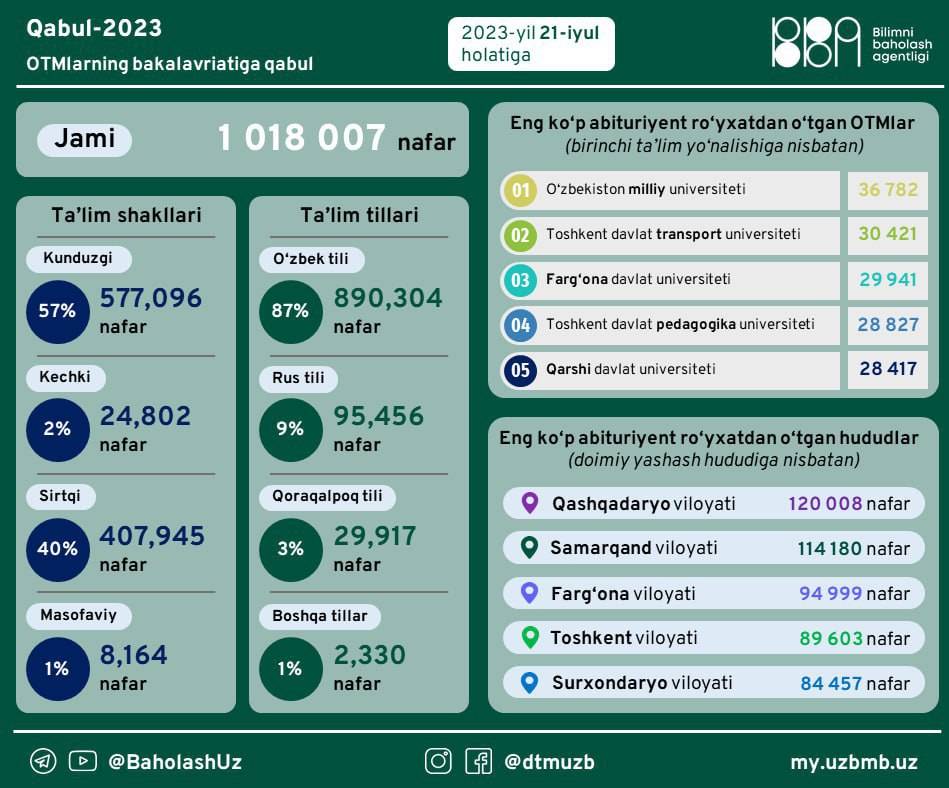 По данным Telegram-канала «Ta'lim nazorati», распределение абитуриентов по языку обучения выглядит следующим образом:
