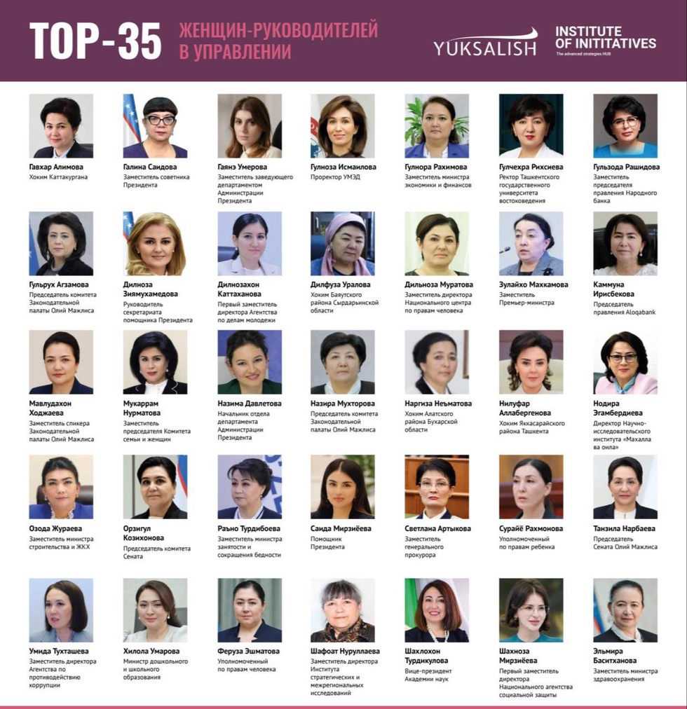 Напомним, движение «Юксалиш» ежегодно публикует рейтинг женщин-руководителей в государственном управлении к 8 марта – Международному женскому дню. Рейтинги уже выходили в 2020, 2021, 2022, 2023 и 2024 годах, а в 2023 году, при поддержке региональных экспертов, был впервые составлен рейтинг лидеров-женщин Центральной Азии.