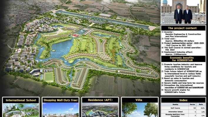 Глава «Hanshin Engineering & Construction Co., Ltd.» также обратил внимание на проект по созданию современного гольф-комплекса международного класса в Самаркандской области на общую сумму 800 миллионов долларов США. Реализовать данный инвестиционный проект планировалось на территории площадью 270 гектара путем создания современной гольф-площадки и жилых помещений для посетителей, международной школы, торгово-развлекательного и выставочного комплекса, современного многоэтажного жилого комплекса и другой прилегающей инфраструктуры.