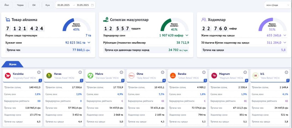 За первые пять месяцев 2025 года общий товарооборот крупных ритейлеров составил более 7,1 трлн сумов.