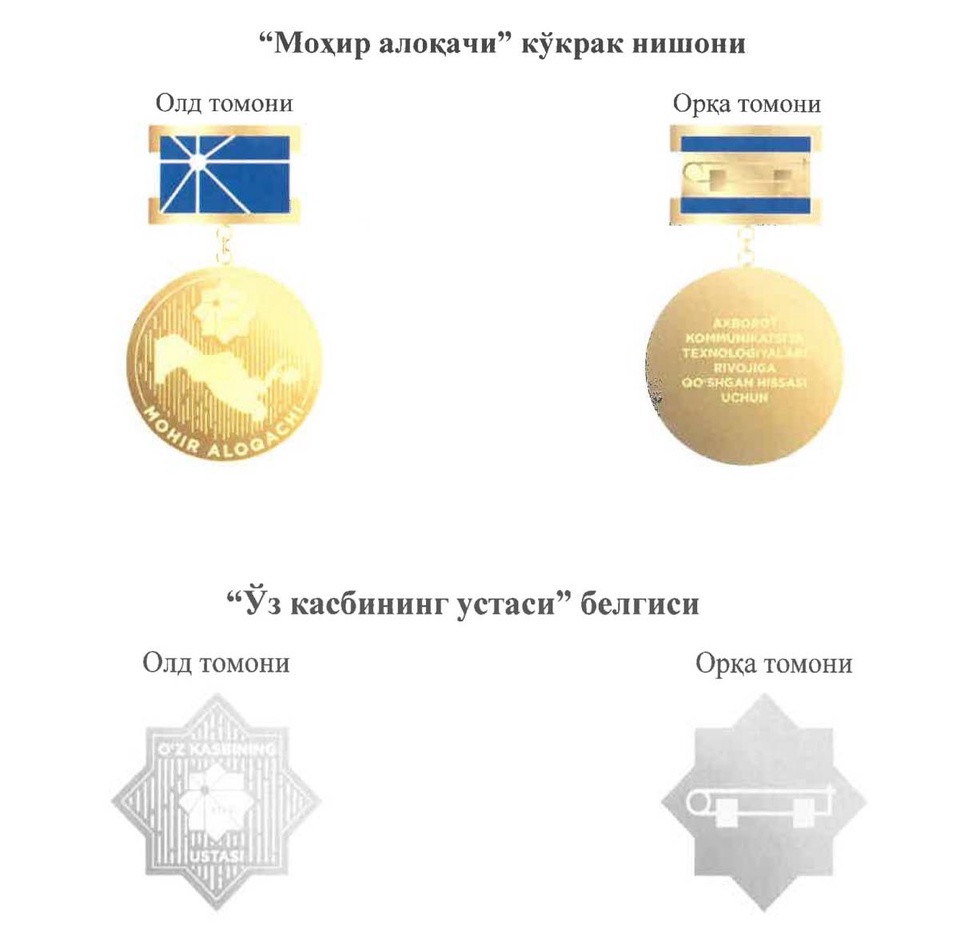 - нагрудным знаком «Моҳир алоқачи» - награждаются граждане, внесшие значительный вклад в развитие сферы информационных технологий и коммуникаций и имеющие стаж работы в этой сфере не менее 15 лет;
