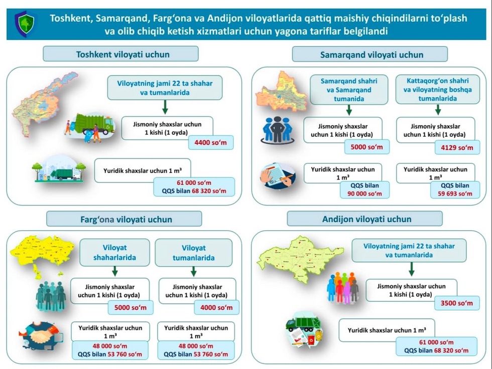 Согласно новому тарифу, размер выплат в 22 городах и районах Ташкентской области для физических лиц составит 4 400 сумов в месяц (для юридических лиц 61 000 сумов (68 320 сумов с НДС);