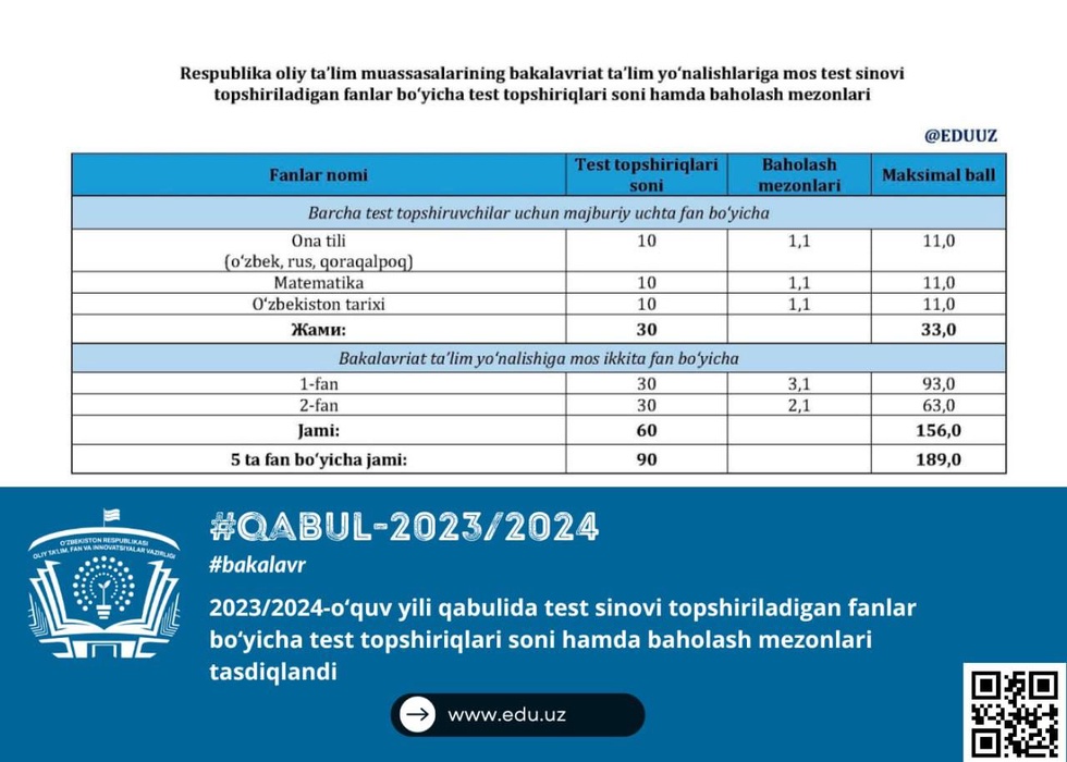 В тройку обязательных предметов для всех абитуриентов будут входить: родной язык (узбекский, русский, каракалпакский и др. языки), математика и история Узбекистана. В каждом из обязательных предметов по 10 вопросов. В общей сложности можно набрать33 балла - по 1,1 балла за каждый вопрос.