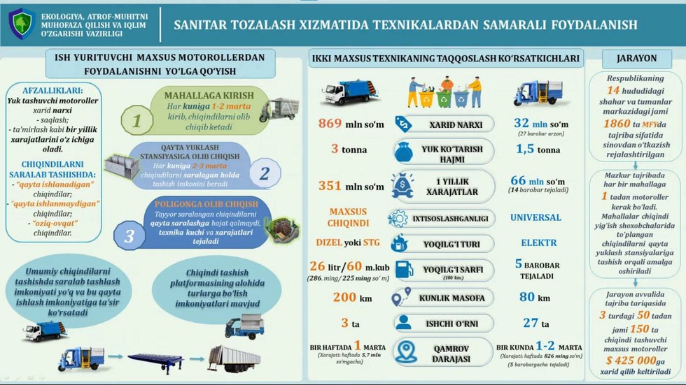 Для информации: закупочная цена грузового мотороллера составляет 32 миллиона сумов, что в 27 раз дешевле нынешних большегрузных мусоровозов, стоимость которых составляет 869 миллионов сумов. Это в 14 раз экономичнее по годовым затратам на содержание, ремонт и рабочую силу транспорта и в 5 раз по расходу топлива.