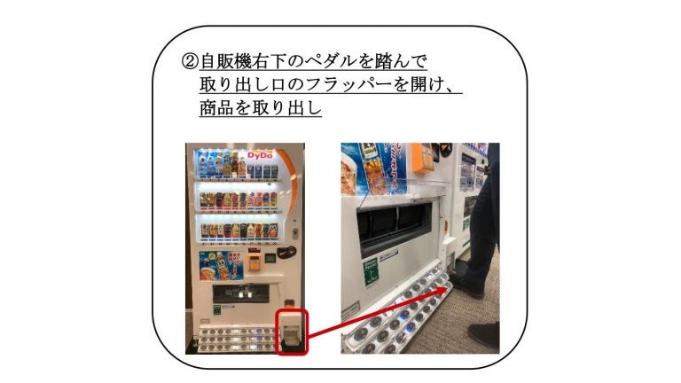 При покупке нужно нажать ногой на кнопку с номером товара, который показан на демонстрационном стенде. Извлечь продукт также можно нажатием ногой на педаль.